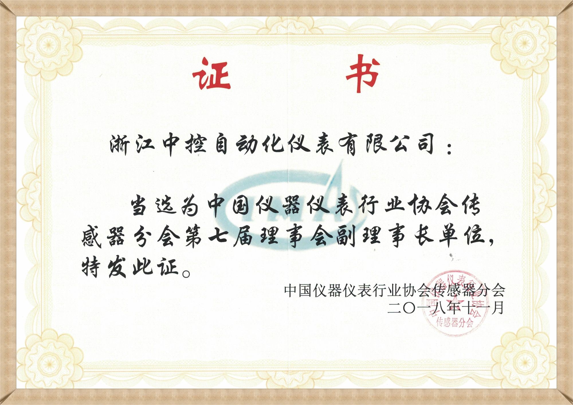 儀器儀表協(xié)會(huì)理事單位證書