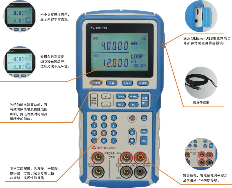 · 最高準(zhǔn)確度:±0.01% · 外置傳感器典型準(zhǔn)確度:±0.2℃ · 信號測量/輸出清零 · 帶過流保護的24V直流電源 · 電壓測量/輸出 · 電流測量/輸出 · 24VDC配電/回路電流測量 · 脈沖計數(shù) | · 幅值可調(diào)的脈沖信號輸出 · 頻率測量/輸出 · 電阻測量/輸出 · 引線電阻補償功能 · 14種RTD、TC測量/輸出 · 測量/模擬低于0℃的熱電勢值 · 內(nèi)置90國際溫標(biāo)雙向查表 · 攝氏度及華氏度溫標(biāo)切換 | · 手動和自動冷端補償 · 模擬二線制變送器信號 · 自動步進和斜坡輸出 · 小型化設(shè)計,便于手持?jǐn)y帶 · 智能閃光插孔指示 · 中文操作界面 · Micro USB電源充電口 · 防護等級IP54 |